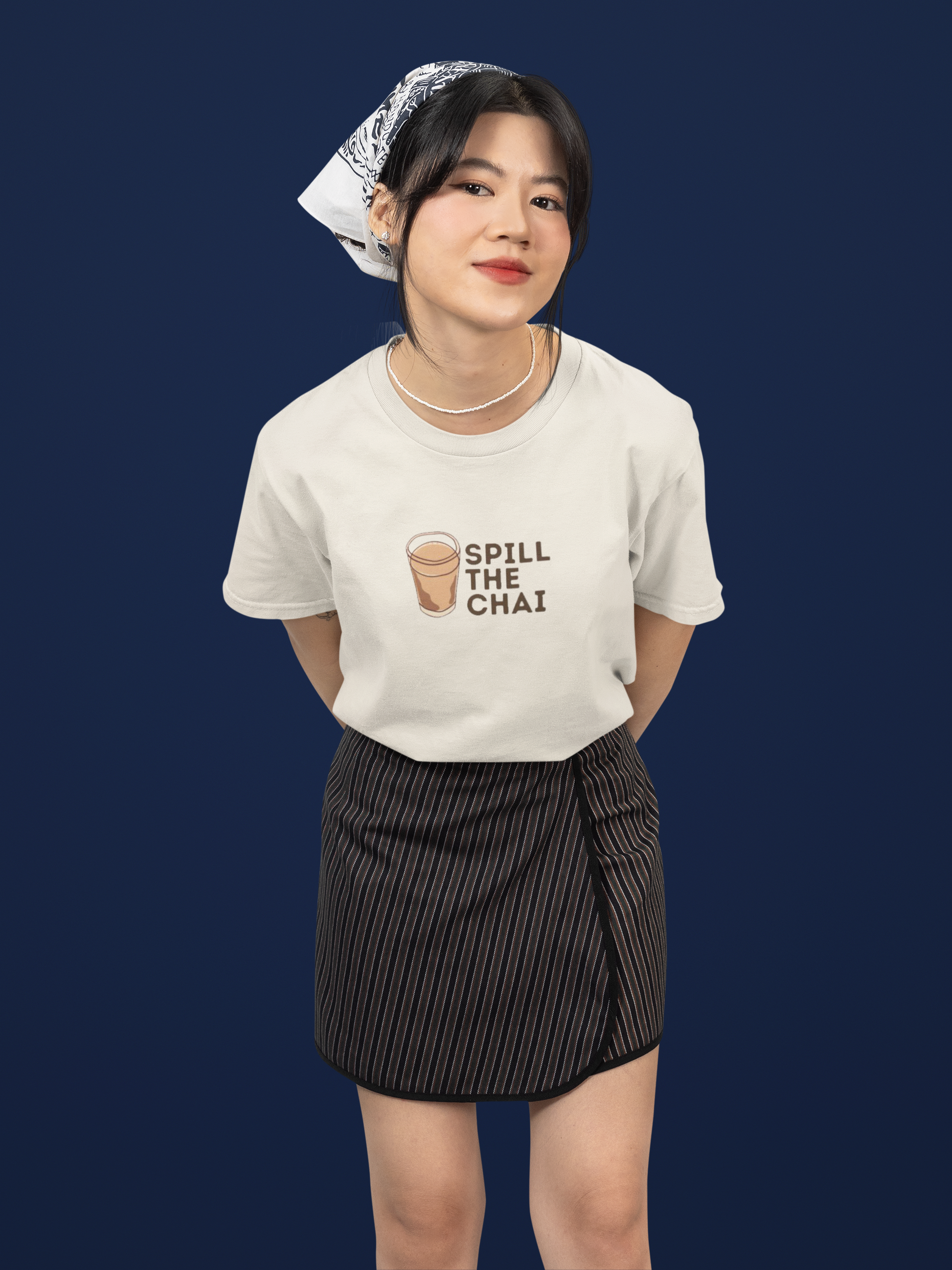 Add some spice to your style with the “Spill the Chai” tee. Inspired by the popular phrase “spill the tea,” this design swaps in chai for a flavorful South Asian twist. Featuring a bold illustration of a steaming glass of chai, it’s a cheeky nod to gossip, culture, and the joy of sharing stories over tea. Comfortable and expressive, this tee is perfect for festivals, casual hangouts, or anyone who loves fashion with humor and identity.